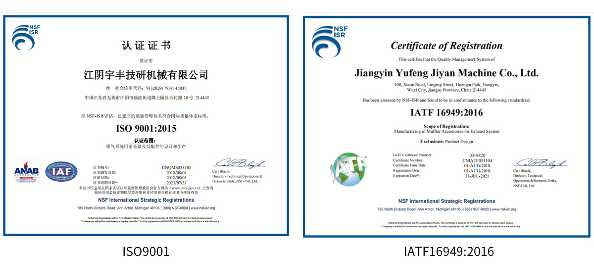 質量是宇豐公司的生命。公司建立了完善的質量保證體系和質量評估體系,于2007年通過ISO9001質量管理體系認證,并于2018年8月通過IATF16949:2016體系認證。